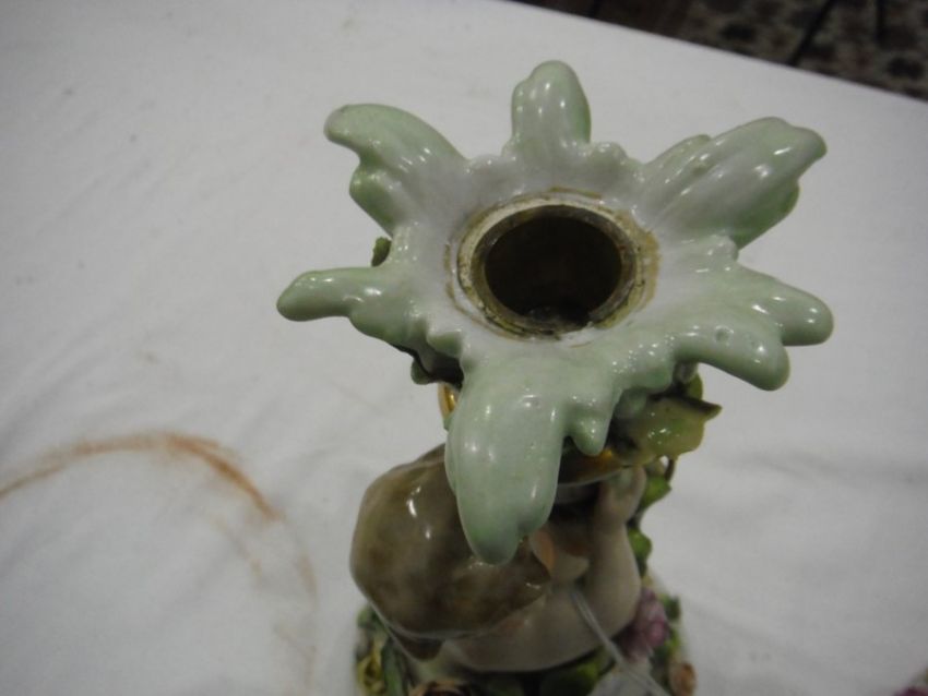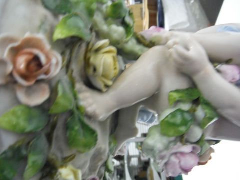 German porcelain centrepiece by Schierholz Plaue, the base and stem modelled with children amid roses and the pierced bowl with applied painted rose decoration, printed mark to base, 38cm high Most flowers with some losses and some leaves again with losses. Wear to the gilt. Crack to a putti foot. General wear and tear throughout.