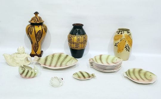 Shorter pottery fish service viz:- two graduated fish-shaped dishes, matching sauce boat and stand and six fish-pattern plates together with three vases, novelty teapot and a swan