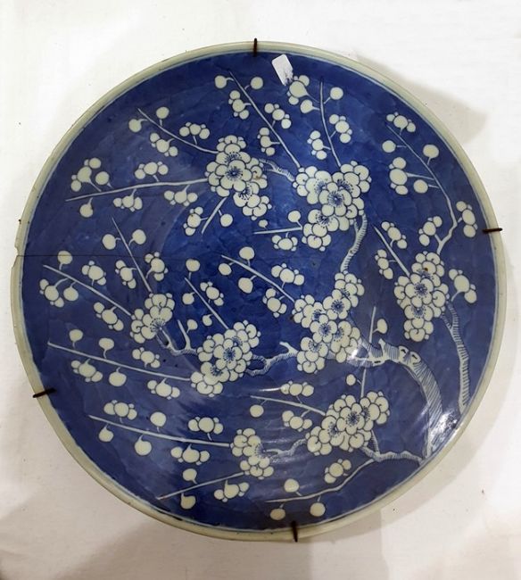 Chinese porcelain charger painted in underglaze blue with precious objects, peonies and flowering sprays, 35cm diameter (repair to rim) and a Chinese porcelain charger with underglaze blue decoration of flowering prunus branches, 30cm diameter (2)