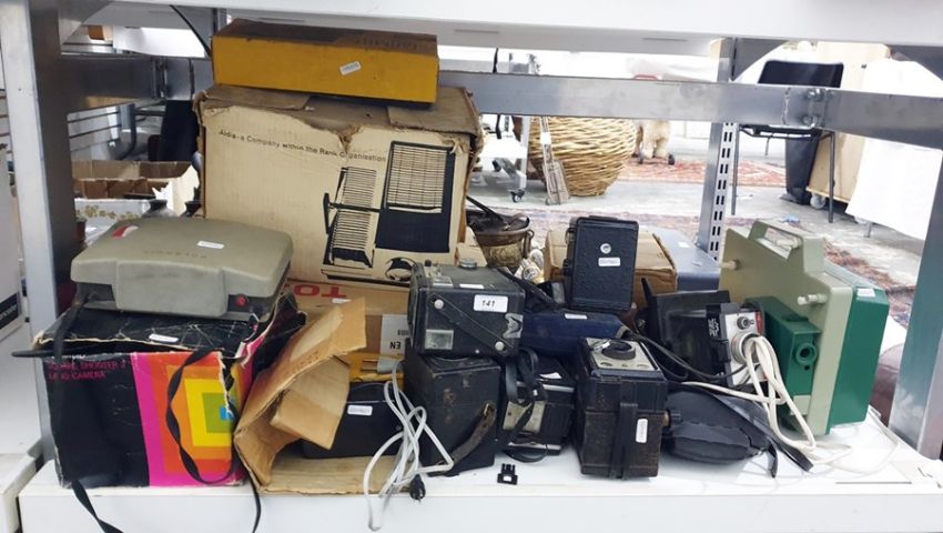 Large collection of cameras and photographic equipment including Box Brownies, Coronet Ambassadors cameras, Polaroid, slide projectors, cassettes, etc