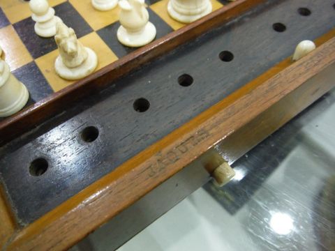 Travelling chess set by Jaques of London, with natural and stained, turned ivory pieces, in mahogany folding box, stamped 'Jaques Patentees, London in Statu Quo Chessboard', cased, 29cm x 23cm when open and with canvas carrying bag.  Information provided by the present owner "The ‘chessboard’ was last used by my father in 1913 - 1915 when he was in the Roughriders, a London regiment that was in one of the last camel charges of the British army. He would play chess with a fellow officer on camel-back until the order was given to charge.  The board was then locked and, when the dust had settled, unlocked and play resumed, on the assumption that both had survived.  My father then switched to the Royal Flying Corps, where the opportunities for playing chess in the air were somewhat limited !"Looks to have original pieces, although these are somewhat worn, with some chips/losses, scratches, splits . Locking mechanism does not appear to work, so needs attention. Some general signs of wear and tear. Bag looks to be newer.