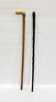 Bamboo cane with worked ivory handle and silver cuff and an African turned hardwood cane (2)