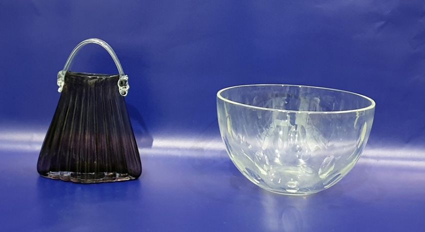 John Rocha for Waterford glass bowl with thumb cut decoration, 25cm diameter and a Murano glass vase in the form of a handbag with purple glass body and clear handle (2)