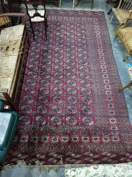 Large Eastern red ground floor rug, the central field with elephant foot guls, on a multi-margin border, the whole in red, cream, black and brown, 382cm x 280cm Wear and uneven wear throughout. Some fading. Fringe missing in places. General wear and tear throughout.