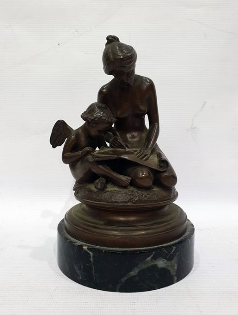 Bronze classical group by Frederick Callcott, kneeling female nude with winged cherub, on circular socle, 16cm high, with marble plinth base