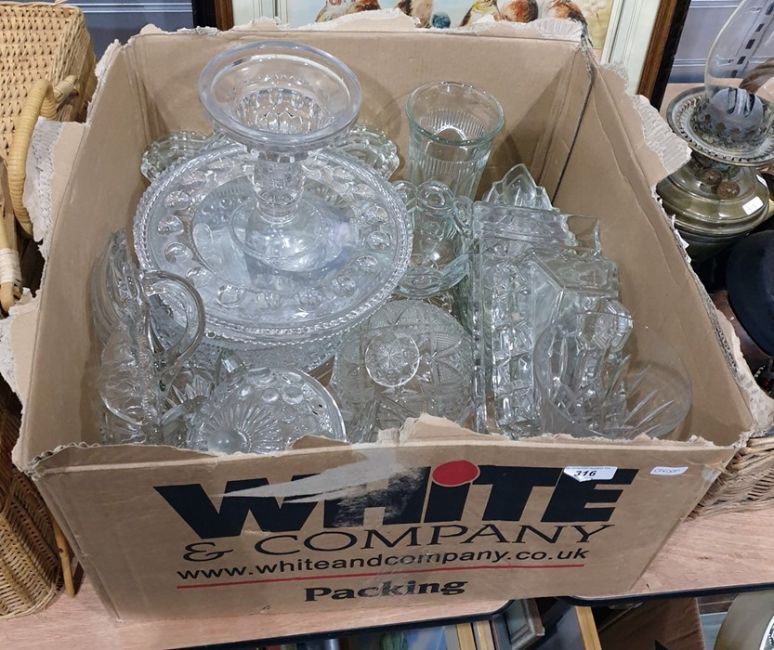 Box of assorted glassware to include glass vase, cake stand, etc