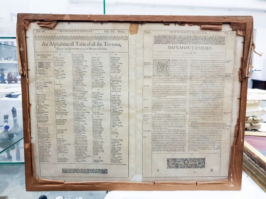 Coloured map after John Speed (1552-1629)County of Monmouth as at 1610 from the Atlas and glazed to reverse to show the text on reverse, 41cm x 54cm Thanks for your enquiry, attached are some further images of the lot. water mark to top right hand corner, some other marks.