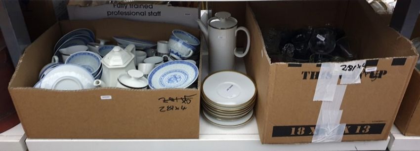 Four boxes of assorted ceramics and glassware to include wine glasses, glass decanter, etc