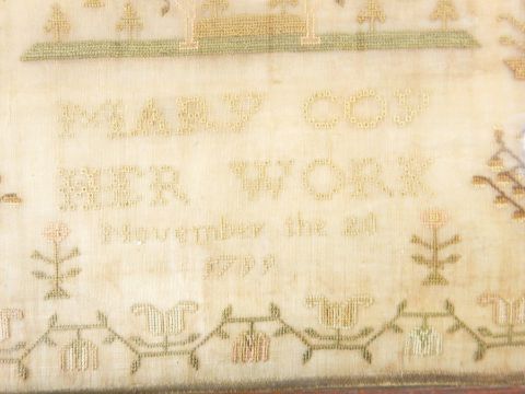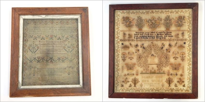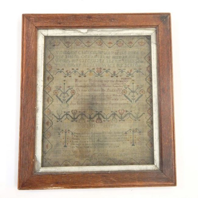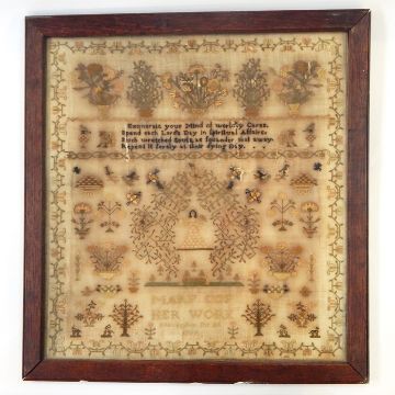 Sampler: cross stitch and embroidered with flowers, birds, insects, bees, verse and a figure of a girl, named 'Mary Cox her work November 20th 1779', faded and frayed, 56 x 51 cms, framedwithSampler: cross stitch, aphabet and verse, named 'Mary Maybrick....1774', faded, 31 x 26 cms, framed  (2)