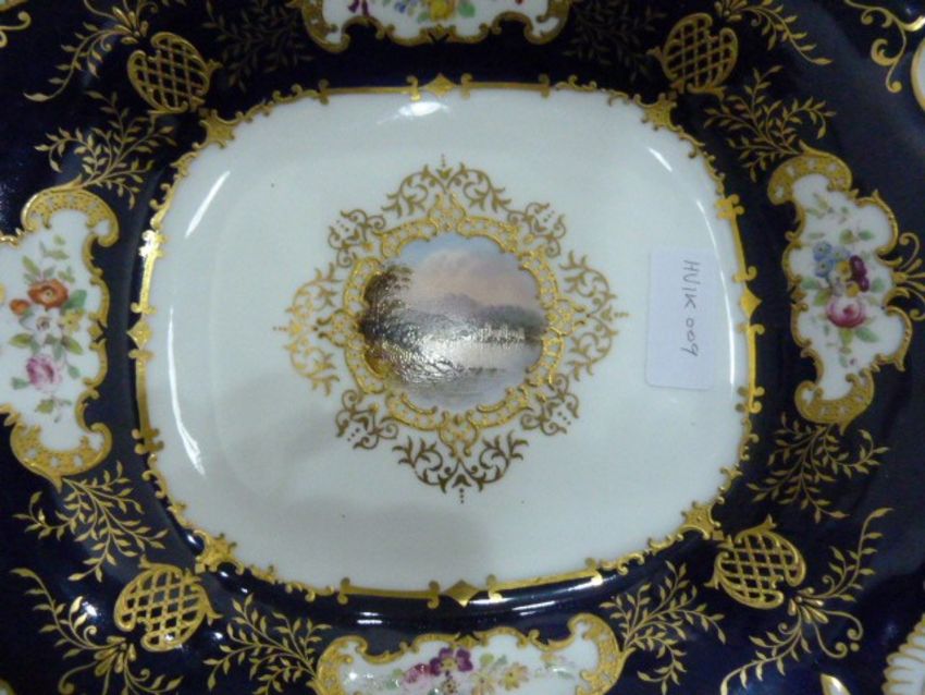 Coalport porcelain part dessert service, pattern No.2308, six pieces,  viz:- three variously shaped serving dishes and three dessert plates, each centred by lake scene painted in lake scene, all with royal blue borders, having gilt patching, foliatework and shaped reserves of floral sprays, and another dessert plate (7)