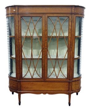 19th century satinwood and cross-banded two-door display cabinet, the moulded top edge above the cross-banded panel, above the two astragal-glazed doors enclosing three shelves, flanked by bowed glass corners, the whole raised upon square section tapering supports to spade feet, 137.5cm x 167cm approx