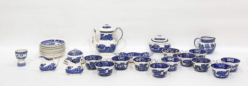 Quantity of Copeland 'Spode's Tower' pattern blue and white teaware including 12 large cups and saucers, teapot/coffee pot, sucriere, pair milk jugs, shaped dish, lidded preserve pot, further lidded dish, further Willow pattern jug and a Japanese cup