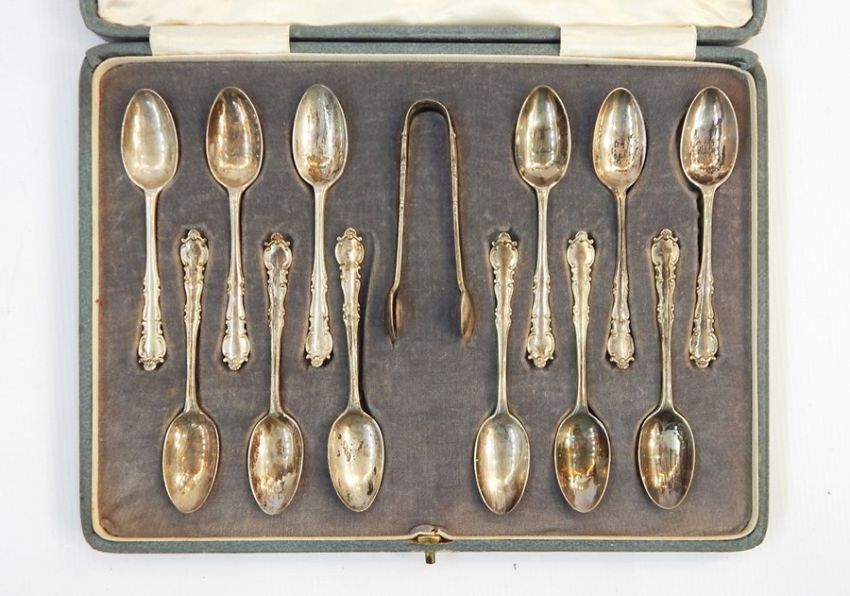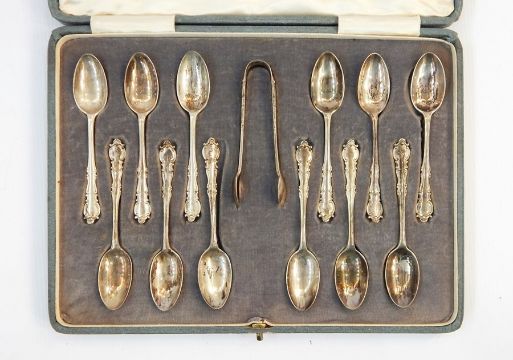 Set of 12 George V silver teaspoons, shaped thread borders, London 1922 and the matching sugar nips, in case and a set of 12 pairs EPNS mounted fish knives and forks, all engraved, in mahogany case (2)