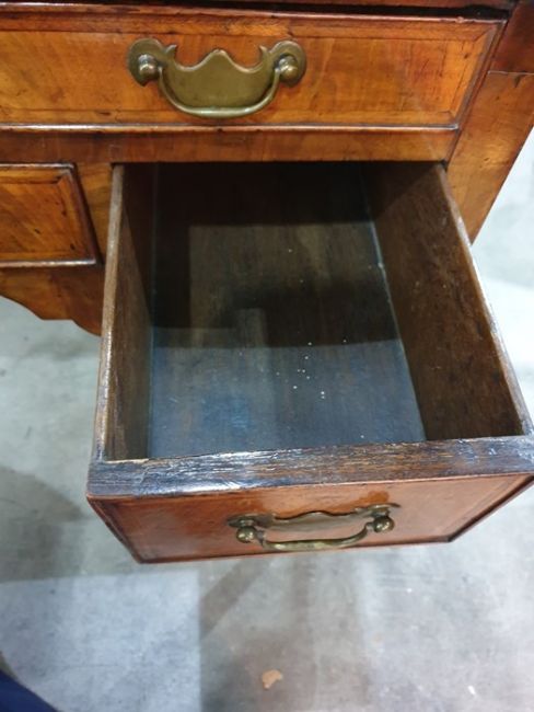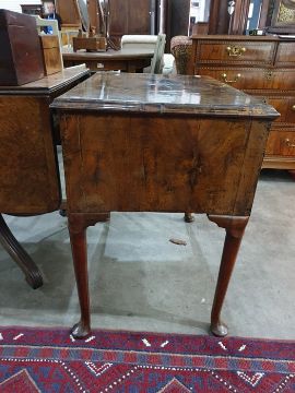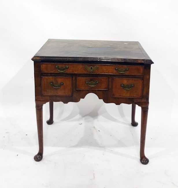 Possibly 18th century oyster walnut lowboy with moulded edge above one long and three short drawers, with shaped apron, turned supports to pad feet, 73cm x 71cm
