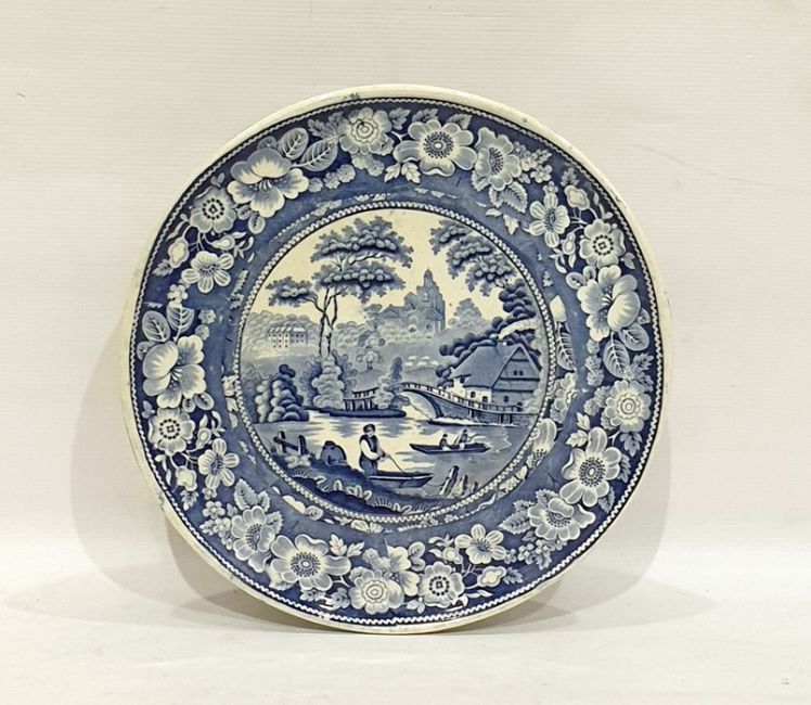 19th century underglaze blue transfer-printed pottery comport, circular with river boating scene to centre, 29cm diameter