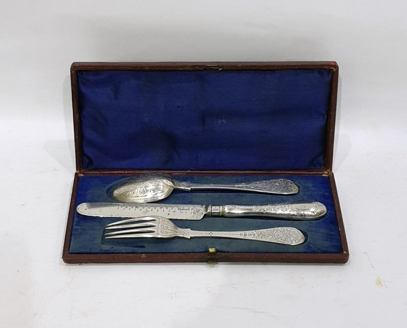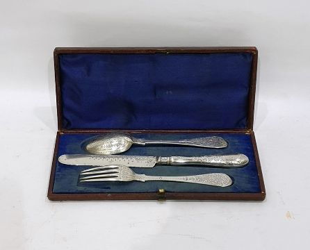 Victorian child's silver christening set, London 1871, three pieces viz:- fork, spoon and silver-handled knife, all flowerhead engraved, fiddle variant pattern, in case