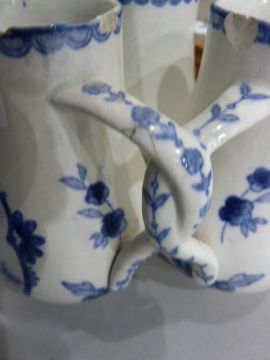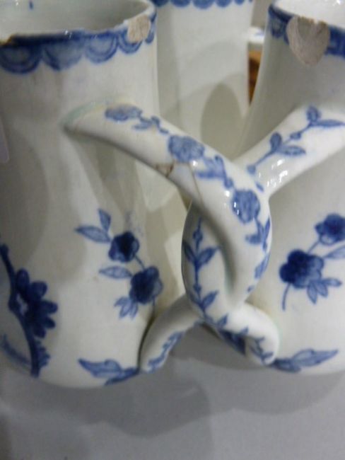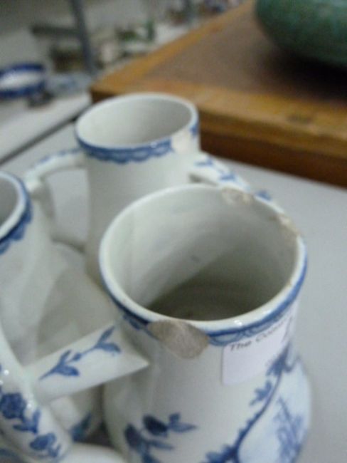 Delft fuddling cup with three beakers, of baluster form with interlocking handles, underglaze blue ship and windmill decoration with floral design, printed incised and painted marks to base