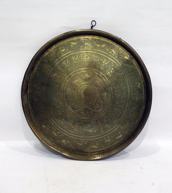 Late 19th/early 20th century brass Benares style tray decorated with assorted animals and gods, 48cm diameter