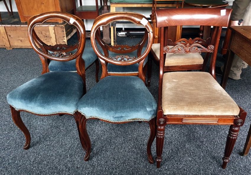 Four 19th century mahogany balloon-back dining chairs with serpentine fronted seats to cabriole legs and two further mahogany dining chairs (6)