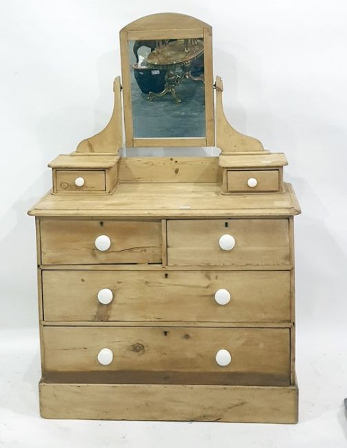 Late 19th century pine dressing chest with single swing mirror, drawered superstructure above two short and two long drawers, to plinth base, 85cm
