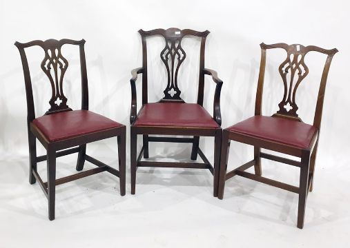 Four early 20th century mahogany dining chairs (3+1) in the Georgian style with pierced and shaped vase-shaped backsplats, red leather drop-in seats, square section supports to stretchered base, stamped to underframe 'WM'