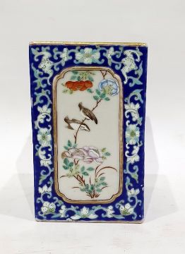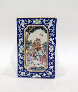 Chinese porcelain vase of square form, each side decorated with panels of figures conversing or exotic birds amongst foliage, bears a six-character seal mark to base, probably Guang-Xu, 12.5 cm tall