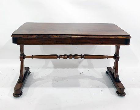 19th century rosewood hall table with two drawers to the top, shaped and pierced end supports united by turned stretcher, the whole raised upon bun feet , 124cm