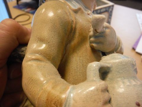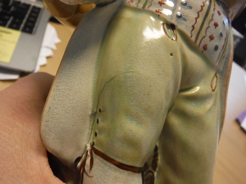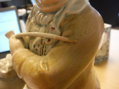 19th century Toby character jug standing figure with tri-form hat, clay pipe, holding jug of ale, on rocky outcrop with moulded handle, hand-painted blue tinged glaze, handwritten inscription to base, 28cm high