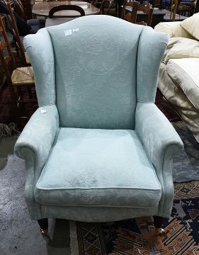 Modern duck-egg blue ground foliate patterned wingback armchair