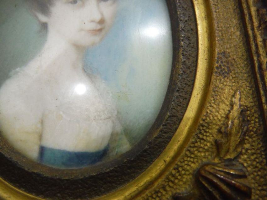 Early 19th century portrait oval miniature on ivory of Fanny Handcock as young girl wearing white dress with blue sash, unsigned, 6.75cm x 4.5cm