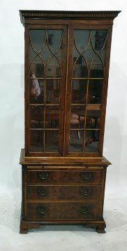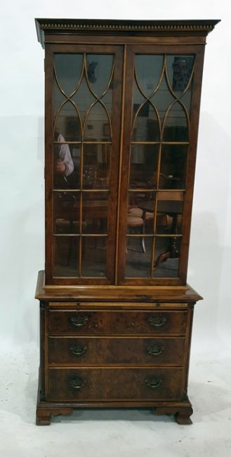 20th century yew bookcase cabinet with dentil moulding cornice above astragal-glazed doors enclosing shelves, above a base of brushing slide and three drawers to ogee bracket feet, 72cm x 176cm
