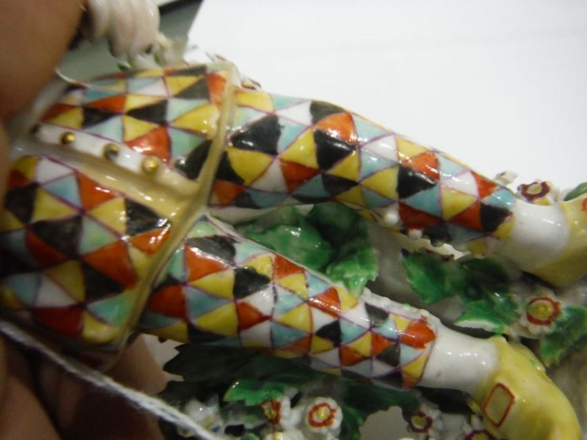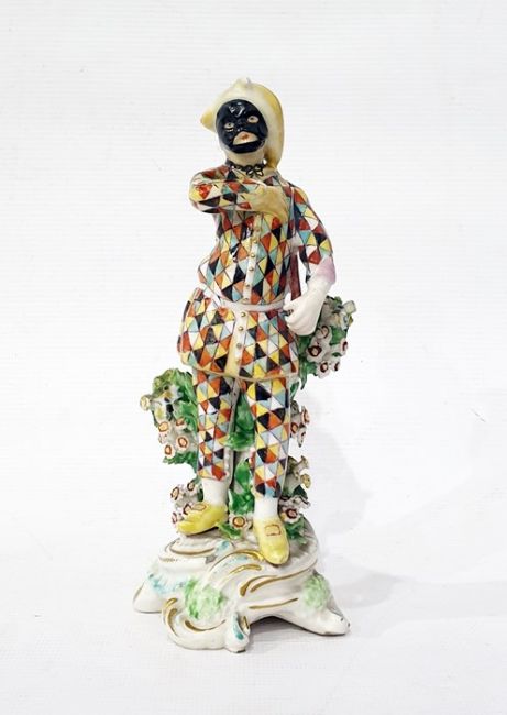 18th century (circa 1772-75) Derby porcelain figure of Harlequin, the figure standing in typical chequered suit with yellow buckle shoes and against a bocage background, all on scroll and floral embossed base, 19cm high