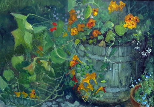 David Raven Oil on board Garden tub with nasturtiums, 21cm x 29cm
