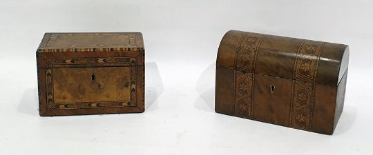 Victorian walnut tea caddy of rectangular form, with domed cover, decorated with bands of parquetry inlay and another tea caddy with parquetry decoration (2)