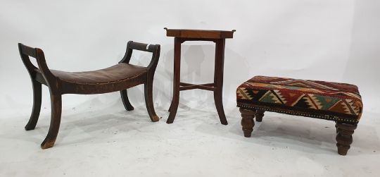 19th century mahogany tray-top table raised upon four supports, to stretchered base, an oak-framed stool with brown leatherette seat and another stool (3)