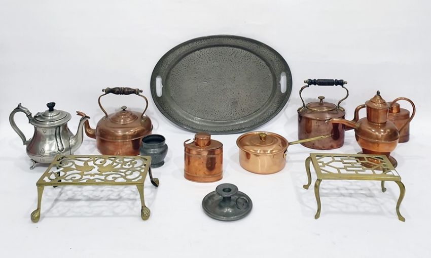 Two copper kettles, a hammered pewter tray, brass trivets and other metal items (1 box)