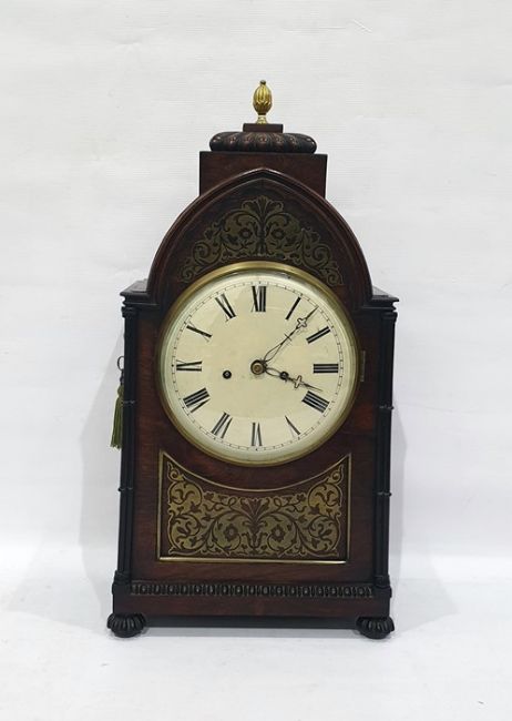 George III mahogany and gilt-brass inlaid repeating bracket clock in lancet-topped case having reeded surmount and brass finish acorn finial, having eight-day striking movement, circular dial with roman numerals, the case with triple cluster columns to the forecorners, brass grilles to the sides and pair ring handles, all on reeded bun feet, 56cm high