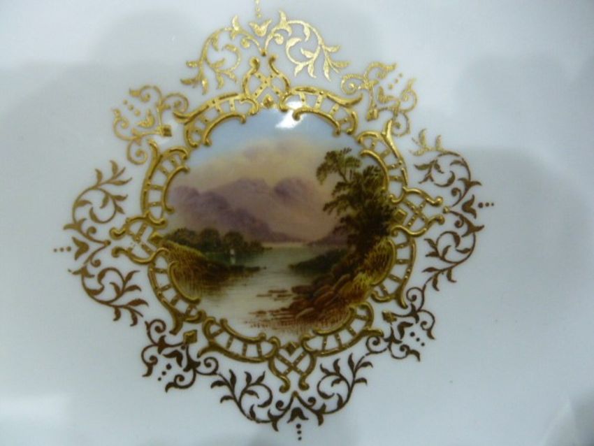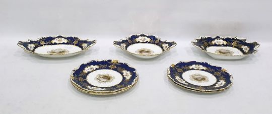 Coalport porcelain part dessert service, pattern No.2308, six pieces,  viz:- three variously shaped serving dishes and three dessert plates, each centred by lake scene painted in lake scene, all with royal blue borders, having gilt patching, foliatework and shaped reserves of floral sprays, and another dessert plate (7)
