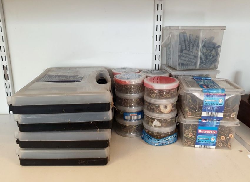 Various boxes of screws, wall plugs, bolts and coach bolts