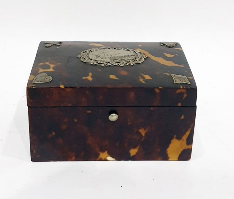 Late Georgian tortoiseshell and inlaid miniature games box containing two small whist markers and a pack of cards, the rectangular box inlaid with hearts, clubs, diamonds and spades to the corners, 10cm wide