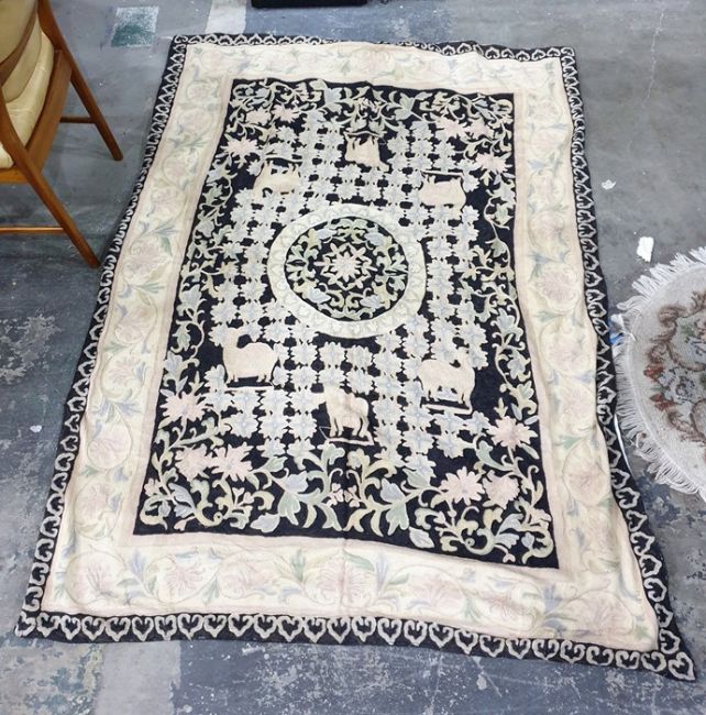 Kashmiri hand-stitched pictorial wool chain rug, 188cm x 136cm
