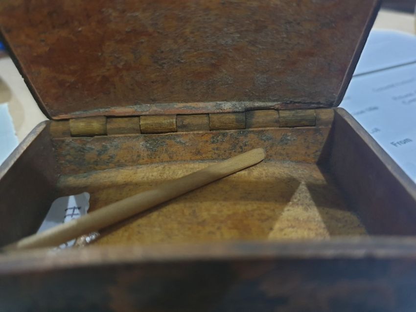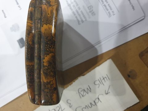 19th century painted wooden snuff box, rectangular and curved, having foliate pokerwork decoration to the bottom and sides, the top painted with hunting dogs in landscape, 7.5cm wide and a cut glass inkwell (2)