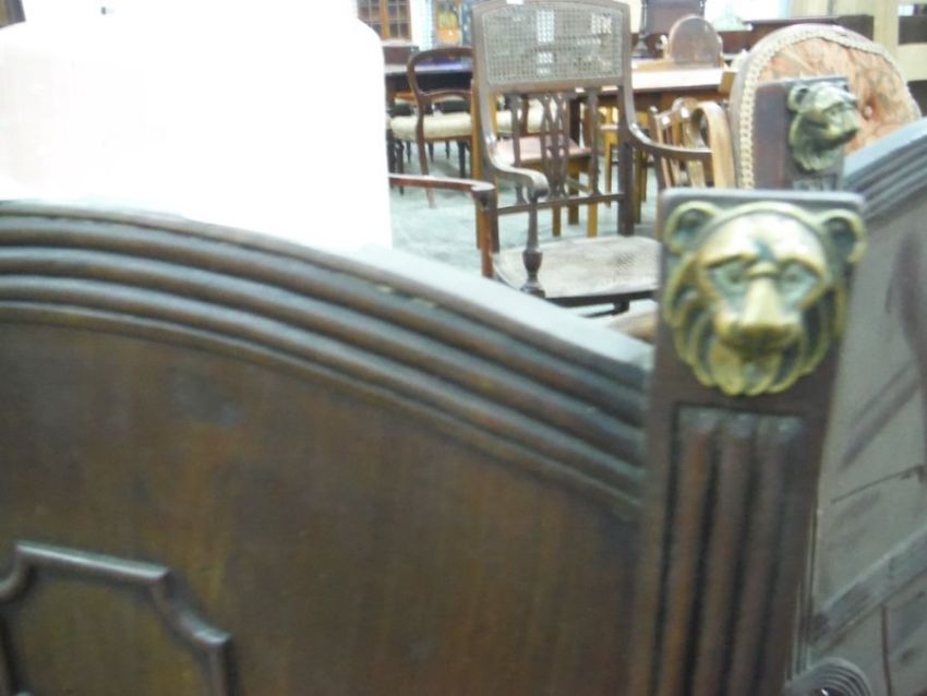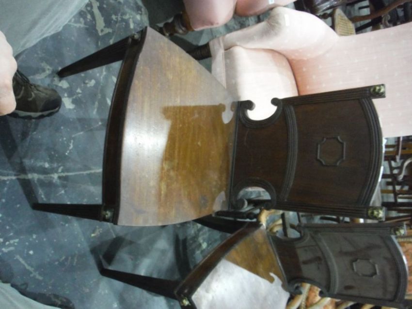 Pair of Regency mahogany hall chairs with panelled backs, supporting brass lion mask mouldings, serpentine fronted seats to tapering reeded legs (2)