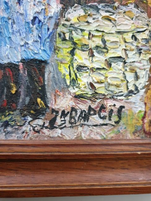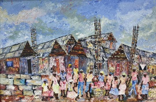 Caribbean scene with group of figures before buildings, signed indistinctly lower right, 60cm x 90cm