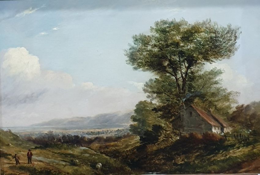 19th century English schoolOil on canvas  Extensive rural coastal landscape with figures and sheep in foreground, 28cm x 41cm