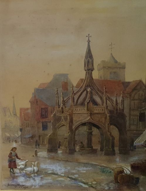 Wallace Peggs (19th century) Watercolour Girl driving geese through a country town, signed and dated lower left 1890, 38cm x 29cm