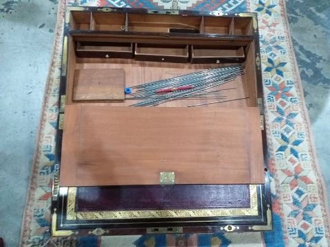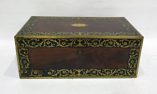 Victorian mahogany writing box of rectangular form, decorated with bands of scrolling brass inlay, on an ebonised ground, the fitted interior with tooled leather writing slope and with single drawer to base, 52cm long