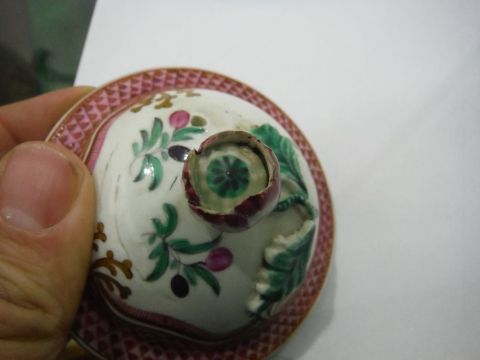 18th century Worcester porcelain famille rose pattern baluster-shaped coffee pot, with stylised flowers and foliage beneath a pink scale border, S-scroll handle, the domed cover with floral flowerhead finial, 24cm high overall, circa 1770
