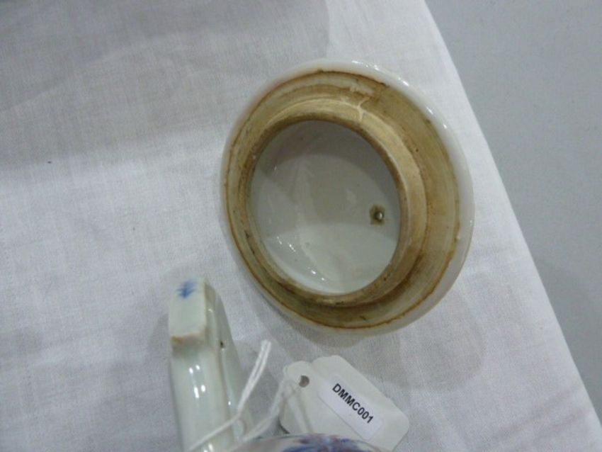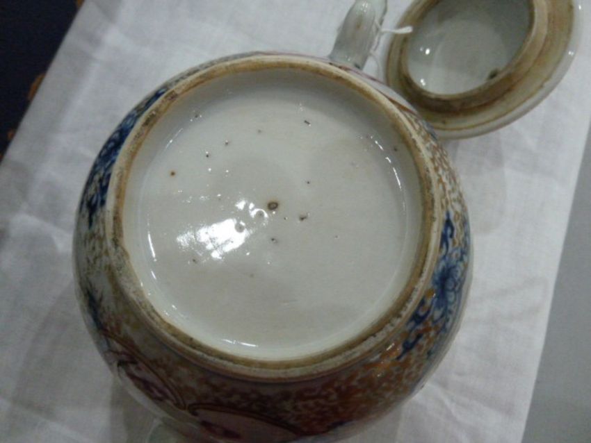 18th century Chinese export porcelain teapot, the bulbous body decorated with panels of figures, 17cm (damage to spout)