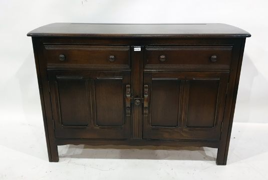 Dark elm Ercol dresser base with two short drawers and two cupboard doors and a table and six chairs (8)